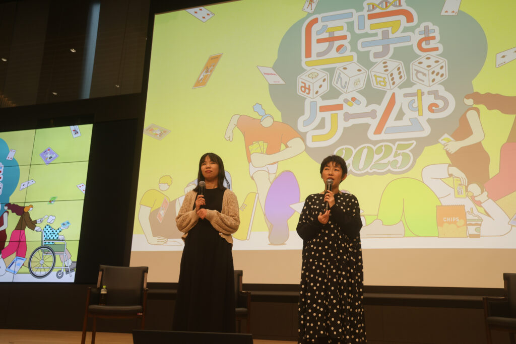 まずは、MEdit Lab代表小倉加奈子先生(写真右)と、しんしんこと發知詩織先生(写真左)がご挨拶。今日のイベントは大きく2本立て。前半は、半年間駆け抜けてきた「医学をみんなでゲームする」ワークショップの内容の振り返り。後半は、ワークショップから生まれた医学ゲームのグランプリを決定する「G-1グランプリ」。