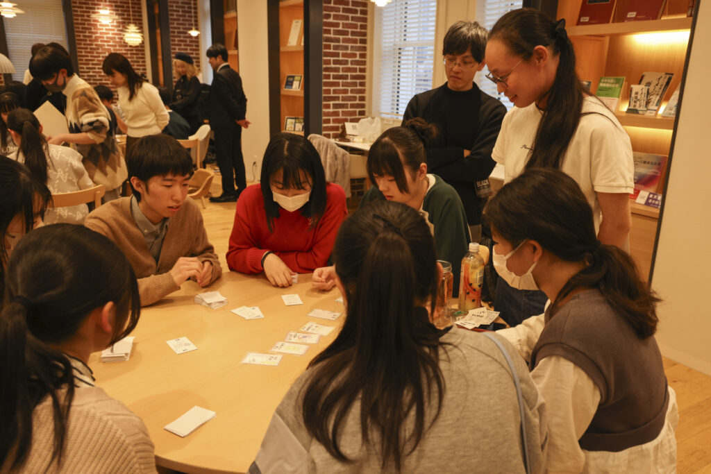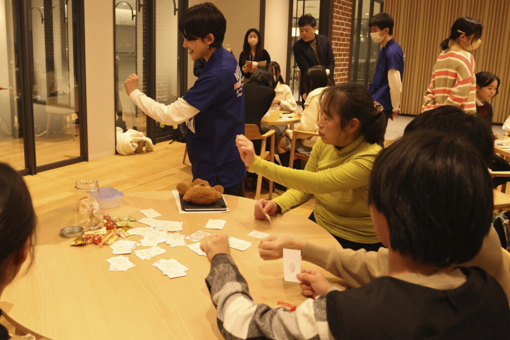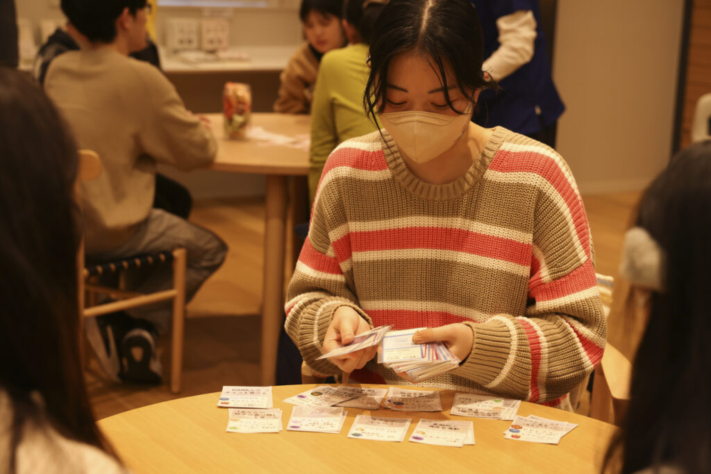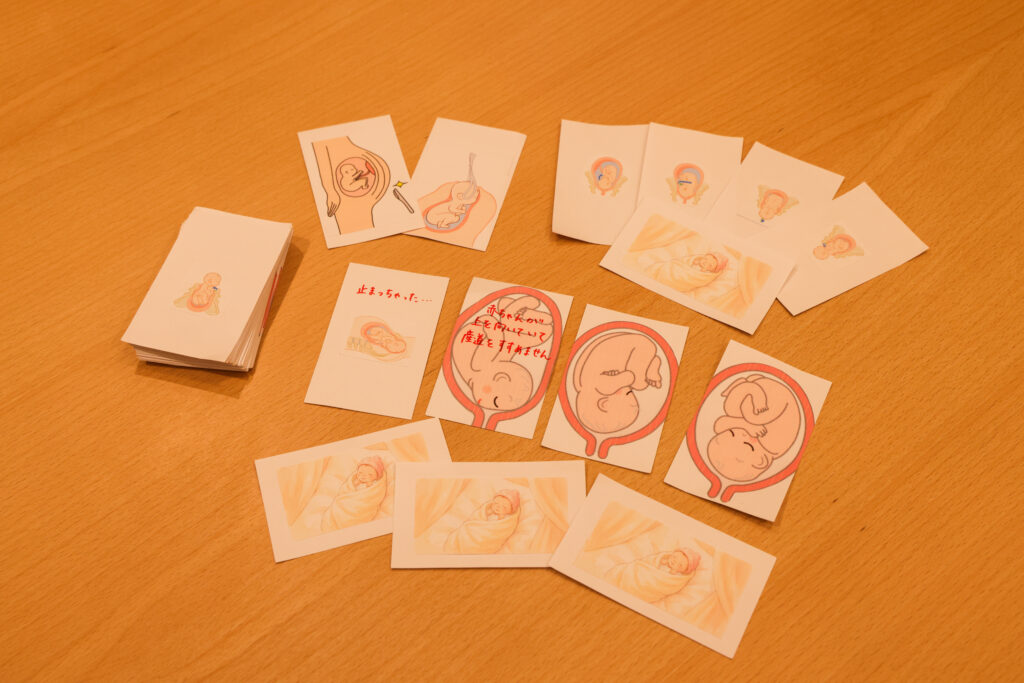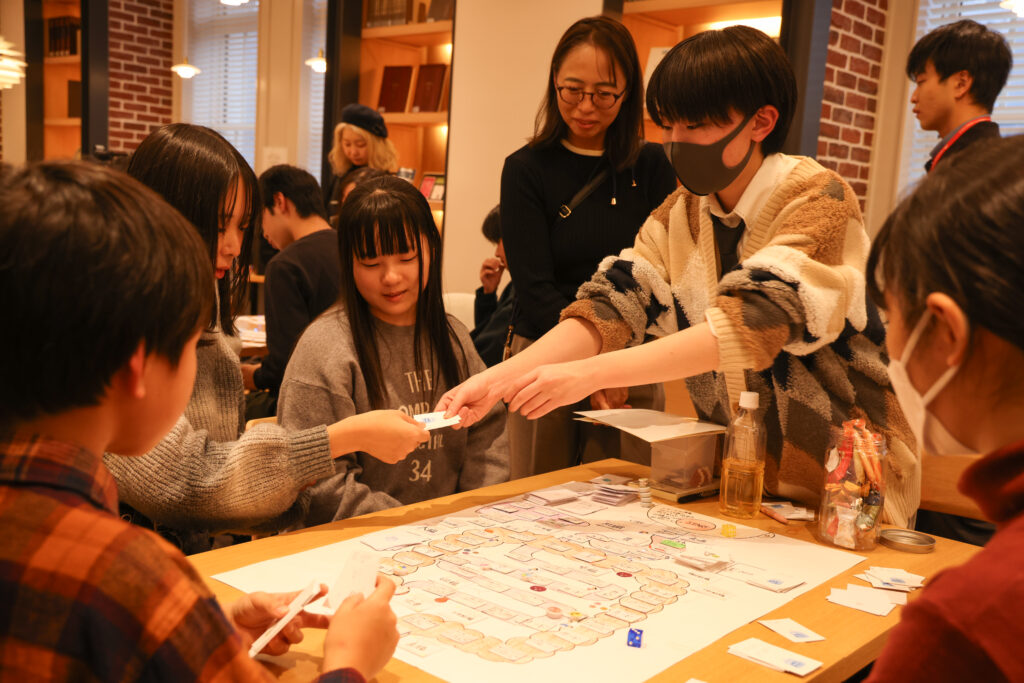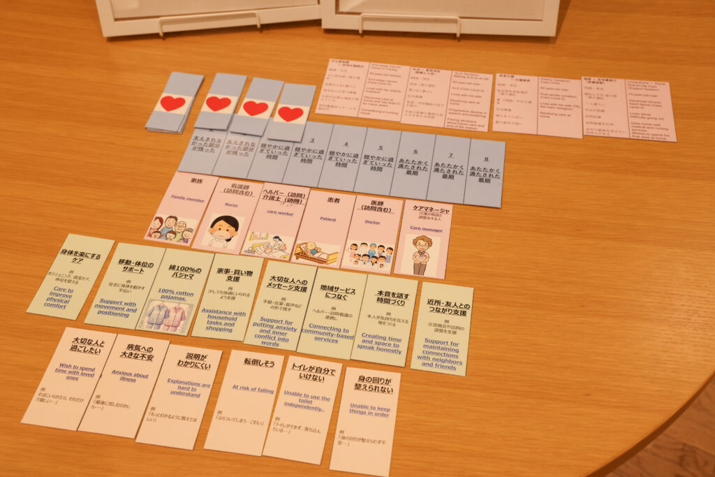 終末期のケアを、医師・看護師など多職種の視点で考える協力型ロールプレイングゲーム。りーさんお祖父様の看取り経験をもとにつくられたという思いの込められた1作です。テストプレイをする保護者や社会人のなかには、ご自身の経験を思い出したのか、うっすらと涙を浮かべる人も。