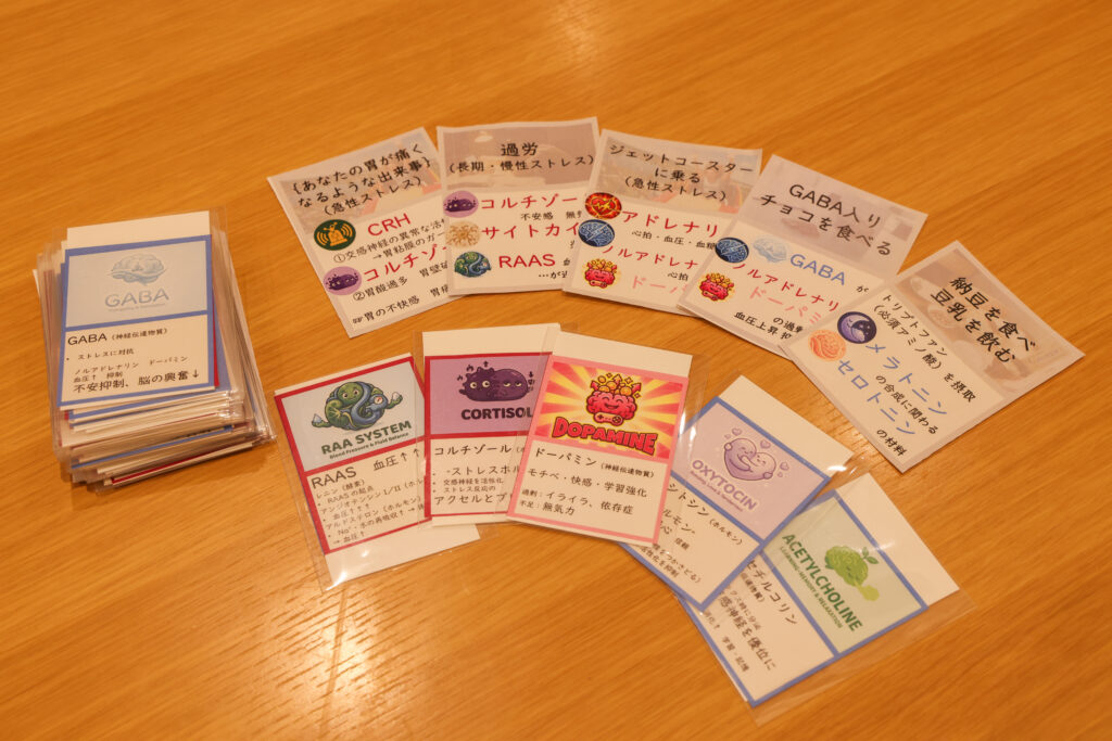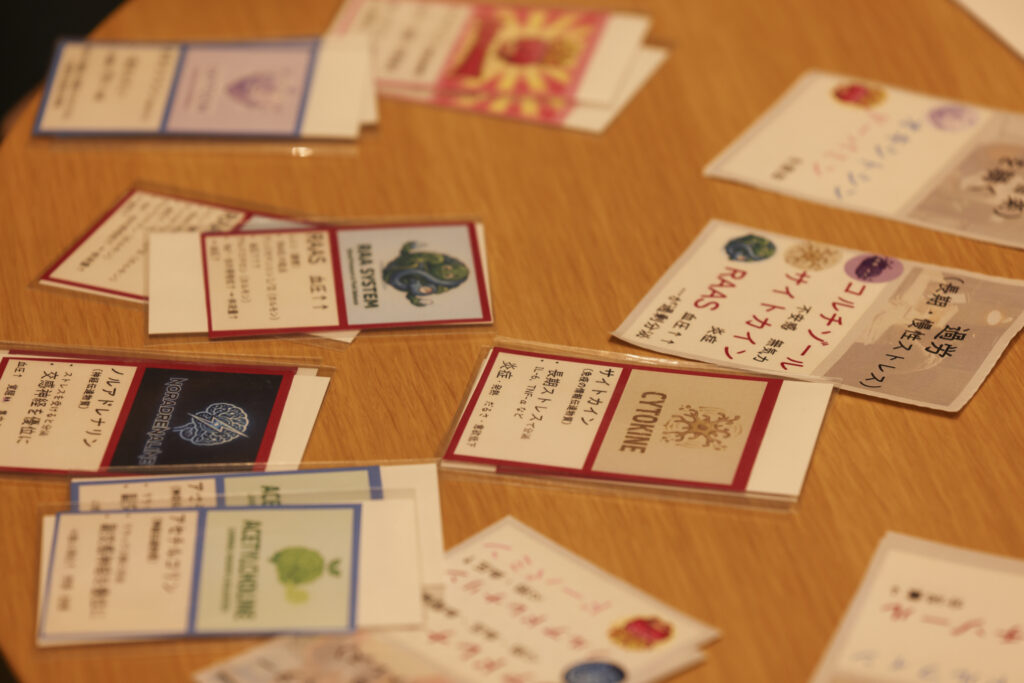 トランプゲーム「神経衰弱」をベースに、交感神経/副交感神経のバランスを考えながらペアを取っていくゲーム。「神経衰弱」と異なるのは、たくさんカードを取ることではなく、交感/副交感神経のバランスを考えて取る必要があるということ。