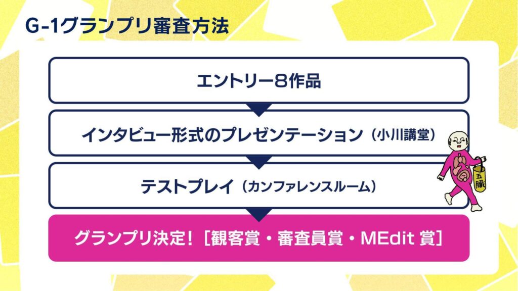 白熱のテストプレイが終了すると、会場の参加者投票を募り、審査員は別室へ。いよいよ、2025年MEdit G1グランプリの結果発表です。