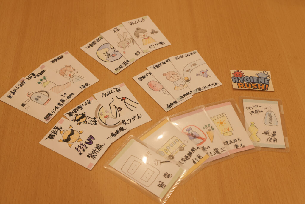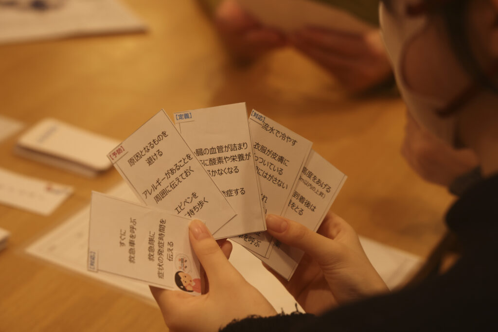 糖尿病や火傷、アナフィラキシーショックなど、さまざまな疾患カードとその説明(原因・予防・対応)カードを見て、瞬時にペアを組み合わせていくスピード勝負のカードゲーム。ご家族でテストプレイをし、幅広い年代に遊んでもらうべく、さまざまな年代の疾患を盛り込んだのがポイント。