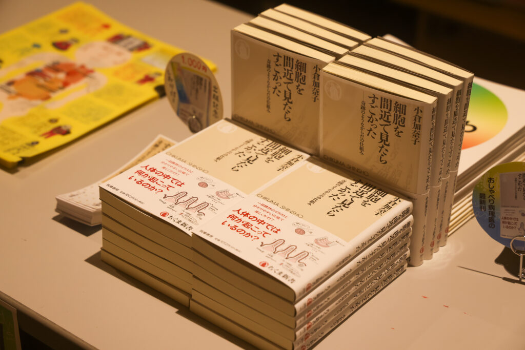 ▲受付には、MEdit Labが制作した、病理診断を体感できるカードゲーム「バナオーマ」や、MEdit Lab代表の小倉先生の新刊『細胞を間近で見たらすごかった』の販売も