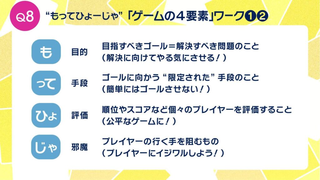▲お題の一例だけご紹介。Q8では、山本貴光先生から教わった「ゲームの4要素」を組み立てて、ゲームのルールを決めていきます